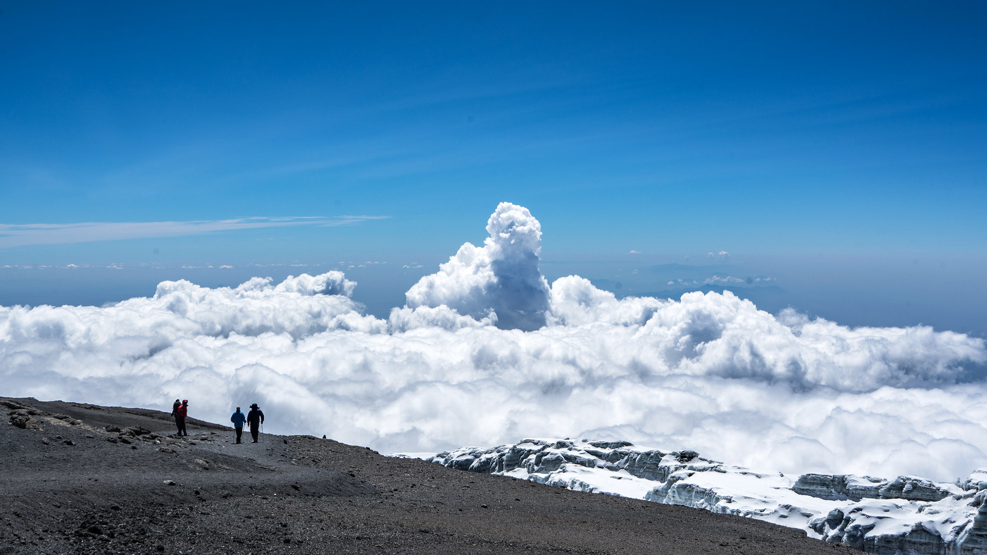Depart just before midnight for the final summit bid. Patience and persistence is the name of game to reach the summit, and this is the coldest, windiest section of your adventure. Most likely by dawn, as the first rays of light start to appear across the Tanzanian landscape, you arrive near the rim at Stella Point, at an altitude of 18,652ft. Here, you are rewarded with the most glorious sunrise you are ever likely to see, appearing over Mawenzi Peak.